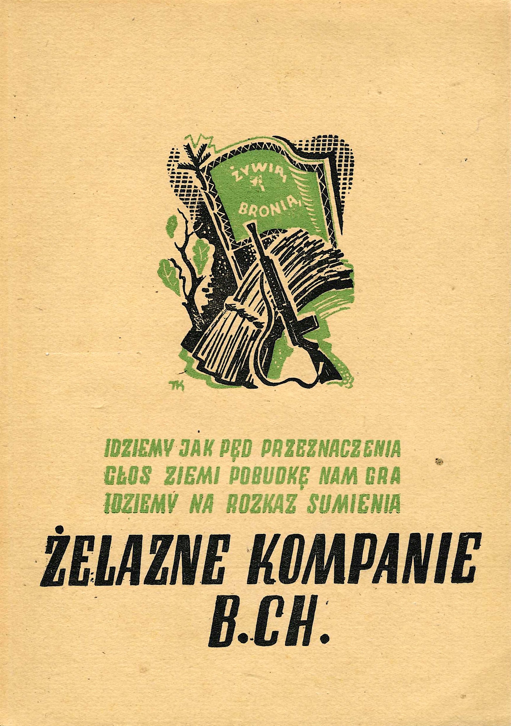 Tyt. w całości: Idziemy jak pęd przeznaczenia, głos ziemi pobudkę nam gra - idziemy na rozkaz sumienia, żelazne kompanie B. Ch.
